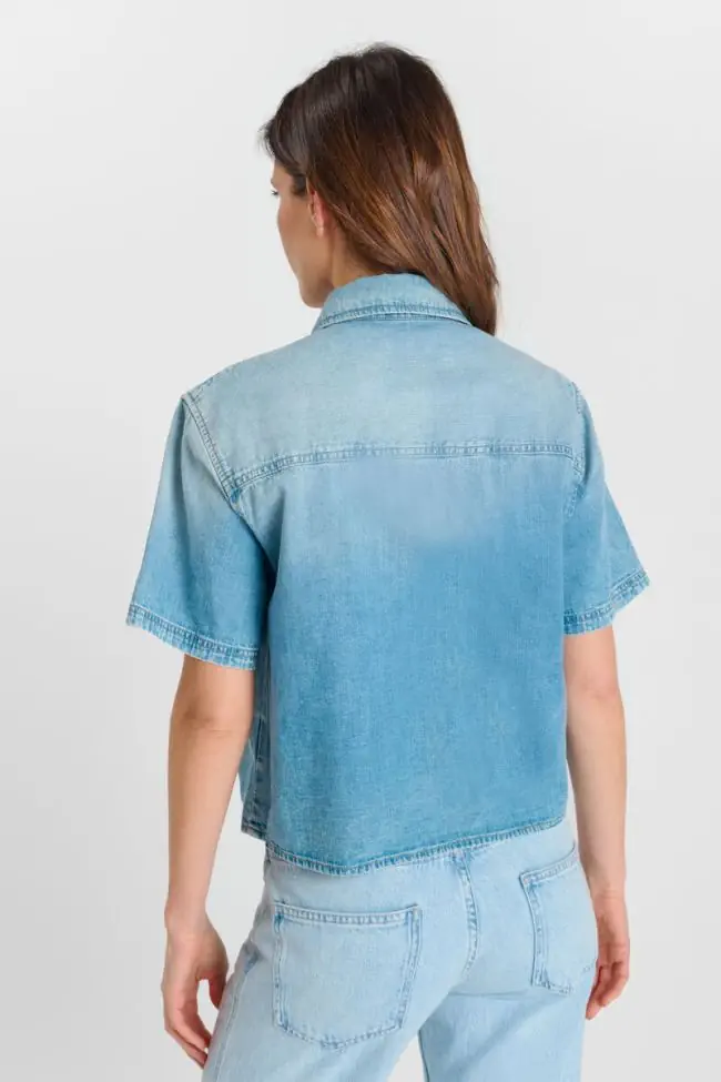 Chemise en jeans bleue délavé à poches plaquées, monogramme poche.