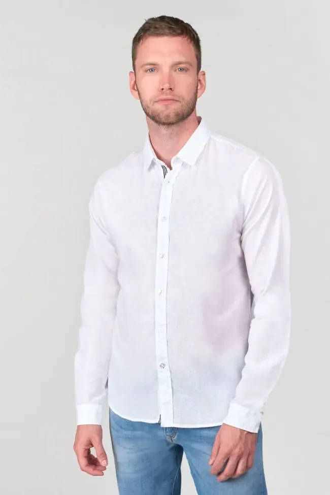 Chemise blanche en lin mélangé et à l’effet chiné.