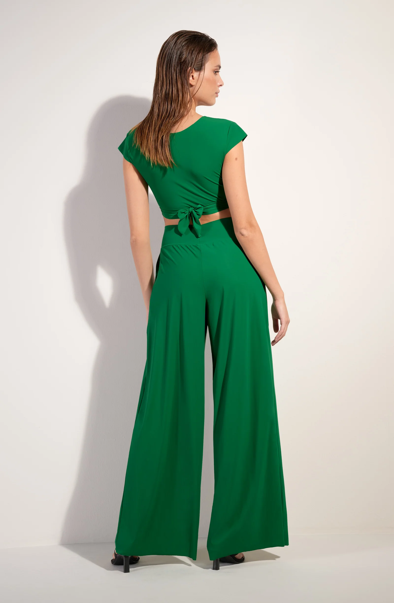 Le voile extensible du pantalon ample PITTA habille la silhouette avec légèreté. La large ceinture élastiquée à la taille et les petites poches plaquées offrent à ce bas une allure infiniment décontractée. Jade, un vert prononcé intensément doux et lumineux.