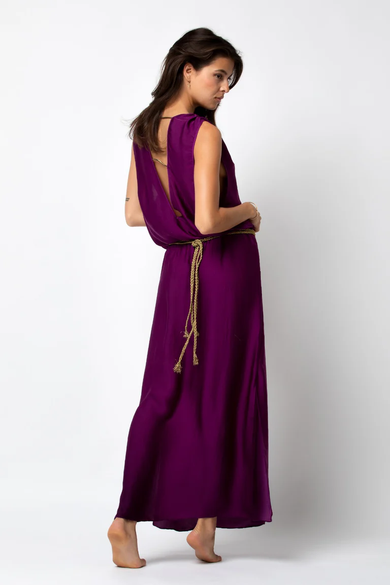 Fabriquée dans un tissu fluide et luxueux, cette robe offre un confort incomparable et une silhouette flatteuse. Ses manches courtes amples et son décolleté en V, à la fois devant et dans le dos, ajoutent une touche de sensualité raffinée, tandis que la teinte violette profonde évoque le mystère et l’élégance.