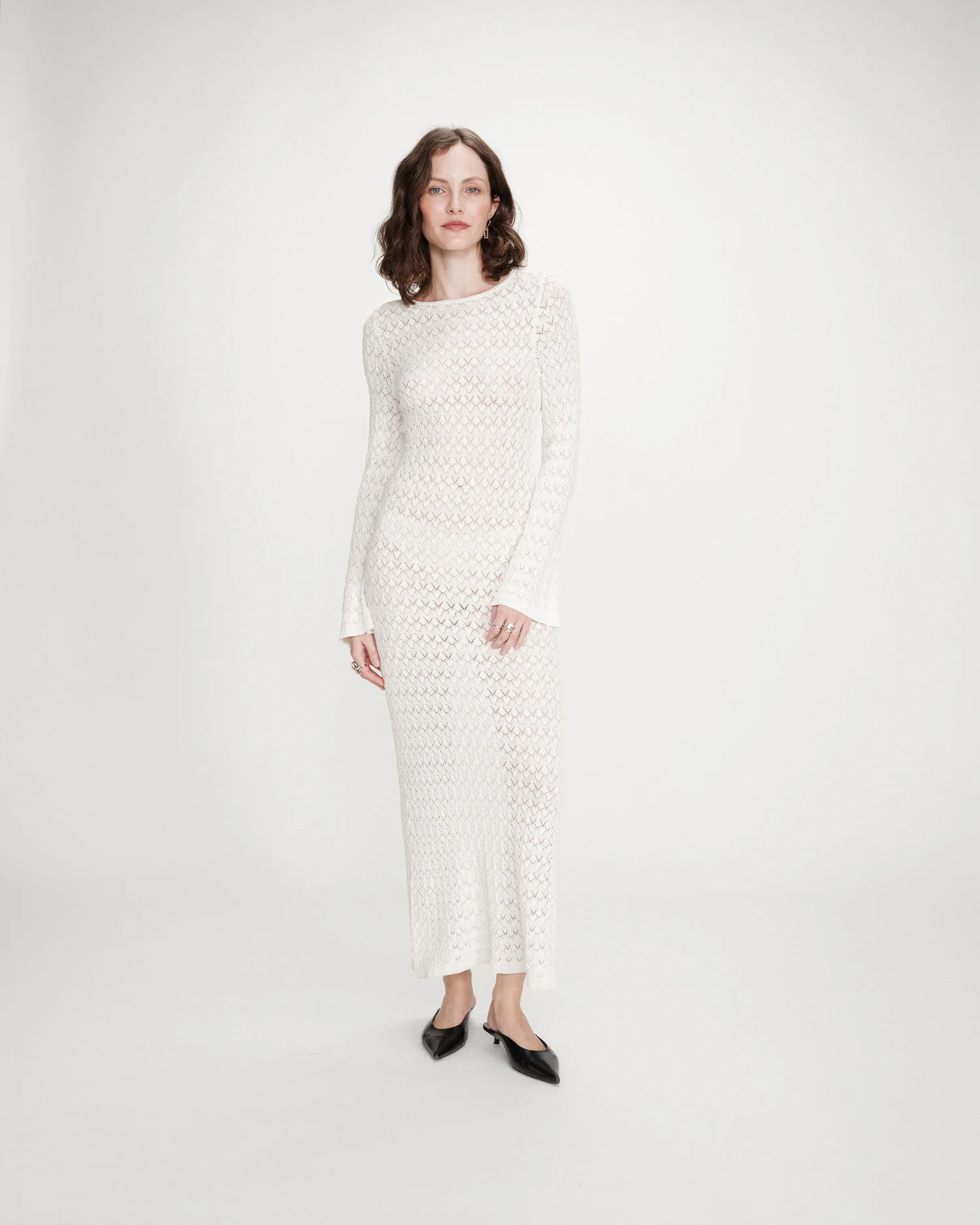 Avec le tricotage ajouré fantaisie et les manches longues évasées, la robe longue VERDAD est une pièce féminine et tendance. La coupe ajustée, évasée au bas, épouse les lignes du corps et sublime les courbes. L’encolure ronde de la robe en maille ajourée VERDAD, sobre et intemporelle, équilibre l’ensemble et souligne la simplicité de la silhouette.